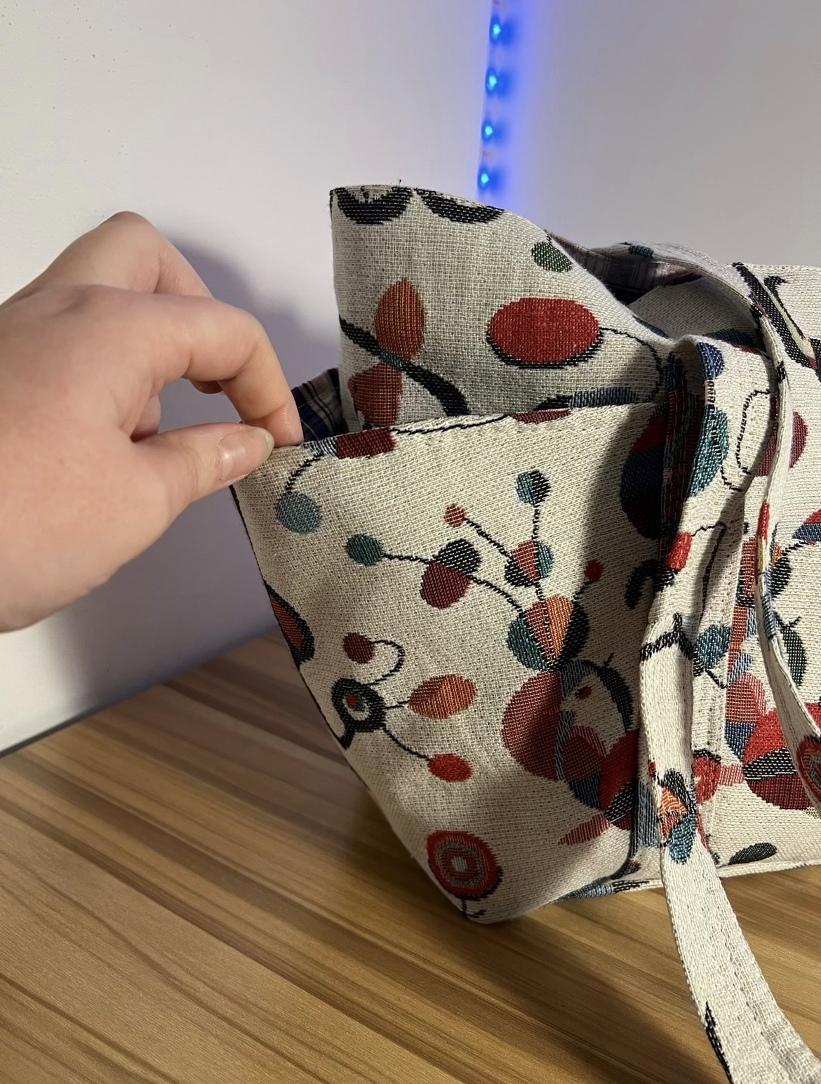 Entretiens : Sac en coton extérieur et intérieur, lavage à la main idéalement pour ne pas modifier la forme.